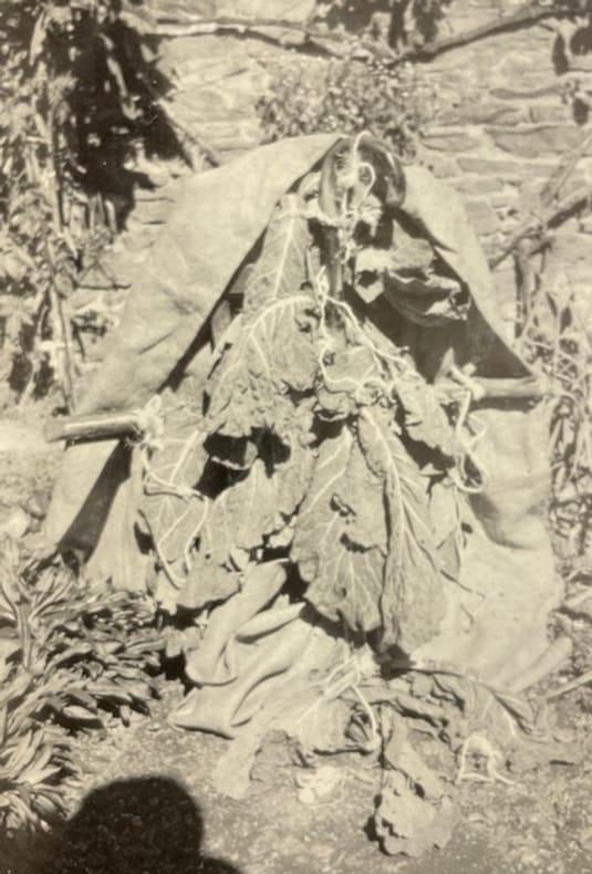 Et bien Dr Ferdière notre devoir à nous qui ne voulons pas du Mal est d’aller plus loin que tous ces Mythes pénibles et malfaisants. Car plus loin et au-delà de toutes ces images libidineuses néfastes, rabaisantes et déprimantes les livres ésotériques nous apprennent que la canne est la volonté de Dieu, et que la femme qu’il a évoquée devant Lui c’est la Nature, avant toute chose. Quant aux feuilles de chou, elle représentent le Néant c’est-à-dire rien du tout, puisque c’est avec rien du tout que Dieu a tout fait. Mais avec Rien du tout il y a mis des chiffres et des nombres 3 – 7 ce 10 — et jusqu’à 12 le chiffre de la maturité dans les formes et il a jeté au milieu le signe de la croix. J’ai pensé à tout cela en composant cette photographie. Malheureusement les objets ne s’y prêtaient guère et je ne suis pas satisfait du tout de ce travail. Mais je ne vois pas le moyen de faire mieux avec ces objets. » Lettre d’Antonin Artaud au docteur Ferdière, 18 octobre 1943