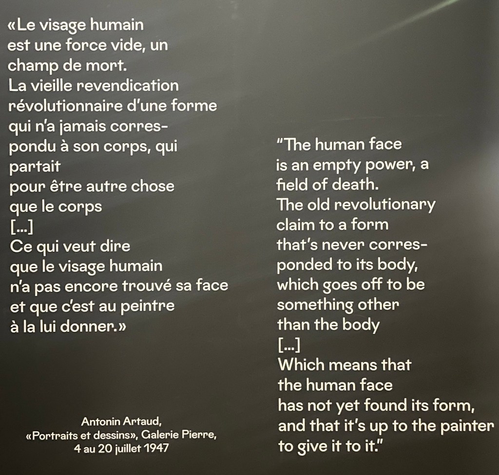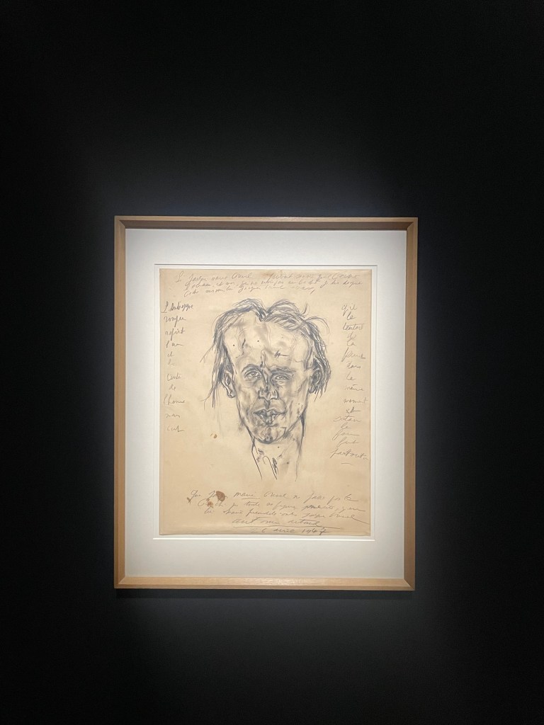 Dès l’entrée, le visiteur est frappé par trois œuvres majeures d’Antonin Artaud : l’imposant Portrait de Jacques Prevel, La Folie, étude de personnage (1946) et La Machine de l’être ou Dessin à regarder de traviole (1946). À leurs côtés, on découvre Le Serpent (L’Œuf dans l’église) d’André Breton, un portrait de ce dernier par Max Ernst, un cadavre exquis réalisé par André Breton, Paul Éluard et Valentine Hugo, ainsi que La Sainte Vierge de Francis Picabia. Le célèbre tract surréaliste Ne visitez pas l’Exposition coloniale est également exposé. Artaud, cependant, n’a pas suivi cette consigne : il a visité l’exposition, une expérience marquante qui influencera la rédaction de son célèbre article sur le théâtre balinais.