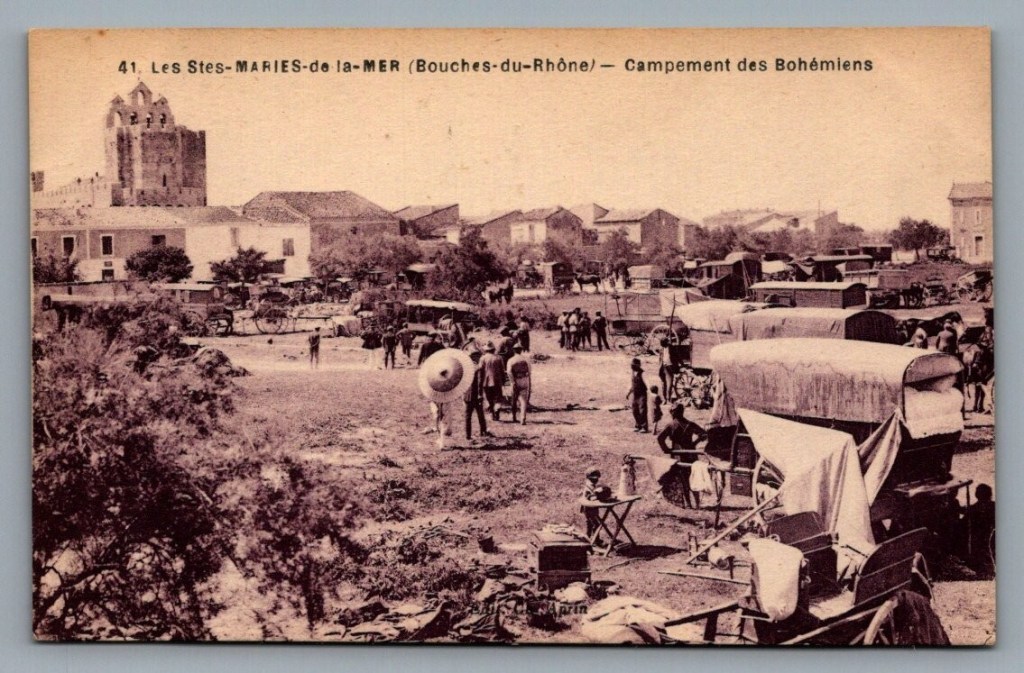 Située au sud de la France, au cœur de la Camargue, la ville des Saintes-Maries-de-la-Mer est un lieu de convergence pour les peuples voyageurs depuis des siècles. C’est là que, selon la tradition chrétienne, Marie Jacobé et Marie Salomé, venues de Palestine après la crucifixion du Christ, auraient abordé, accompagnées de leur servante Sara la Noire. Chaque année, au mois de mai, les Gitans s’y rassemblent pour célébrer cette dernière, devenue leur sainte protectrice. Pendant plusieurs jours, le village se remplit de musique, de danses et de processions : la statue de Sara est portée jusqu’à la mer dans une cérémonie empreinte de ferveur et de joie.