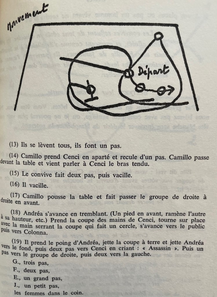 Note personnelle de Roger Blin, prise durant les répétitions des Cenci (1935) à partir des indications d’Artaud, publiée par Alain et Odette Virmaux et probablement typographiée par Valère Novarina.